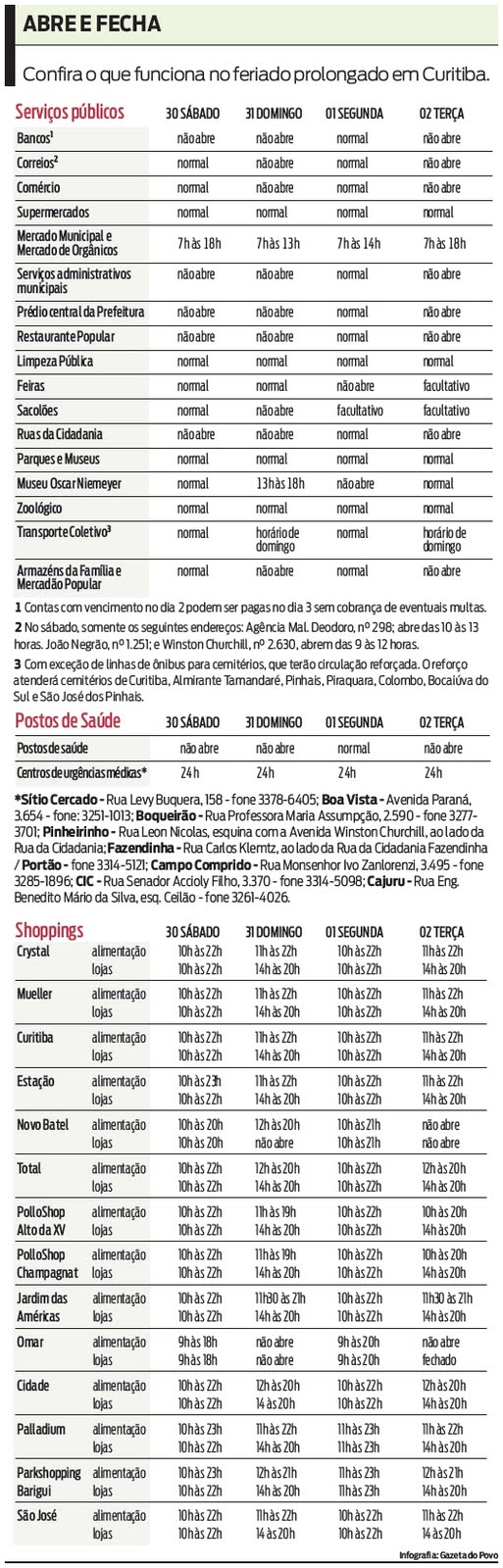 Confira o que funciona no feriadão na figura abaixo (clique nela para aumentar).